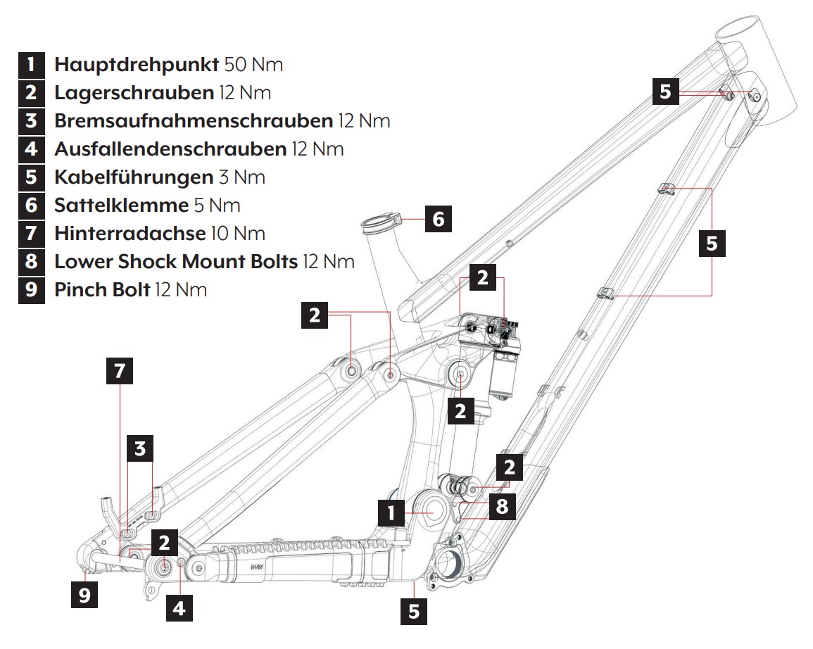 Alle Schrauben am Rahmen müssen mit dem vorgegebenen Drehmoment angezogen werden, um Beschädigungen der Bauteile zu vermeiden. Die empfohlenen Drehmomentwerte findest du in der unten stehenden Grafik. Achte darauf, die Schrauben weder zu fest noch zu locker anzuziehen.