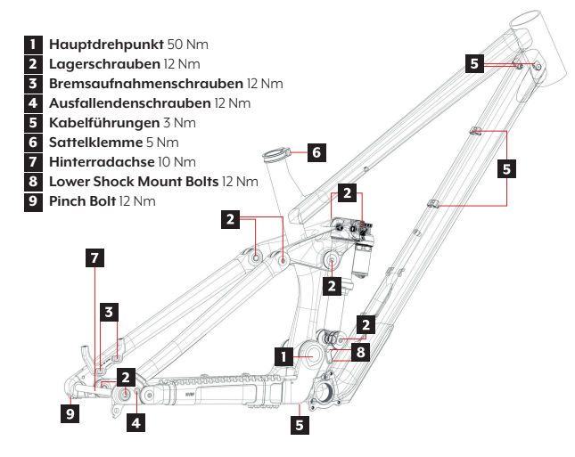 Alle Schrauben am Rahmen müssen mit einem vorgegebenen Drehmoment angezogen werden. Die empfohlenen Drehmomentwerte sind in der unten stehenden Grafik aufgeführt. Ein zu starkes oder zu schwaches Anziehen der Schrauben kann die Bauteile beschädigen. Alle Schrauben an den Drehpunkten am Rahmen sollten mit etwas Fett auf den Kontaktflächen am Schraubenkopf und einem kleinen Tropfen mittelfester Schraubensicherung auf dem Gewinde montiert werden. Die Schrauben, mit denen die Bremsaufnahmen am Rahmen befestigt sind, werden dagegen nicht gefettet – die Schraubensicherung ist hier jedoch besonders wichtig. Bei den Schrauben, mit denen die Kabelführungen befestigt sind, empfehlen wir, auf die Schraubensicherung zu verzichten und nur Fett zu verwenden.